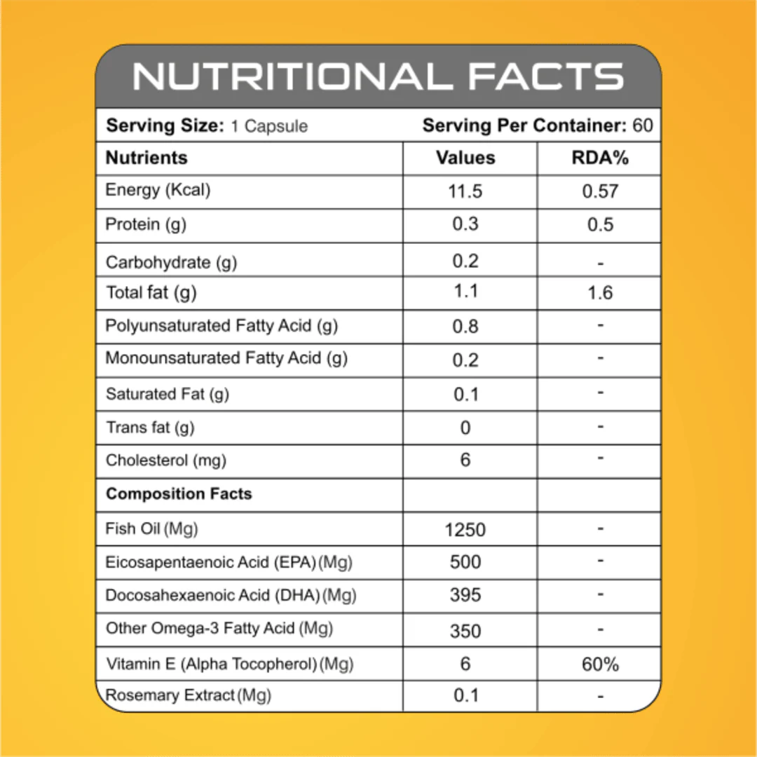 1 capsule delivers 1250mg Fish Oil with 500mg EPA and 350mg DHA.